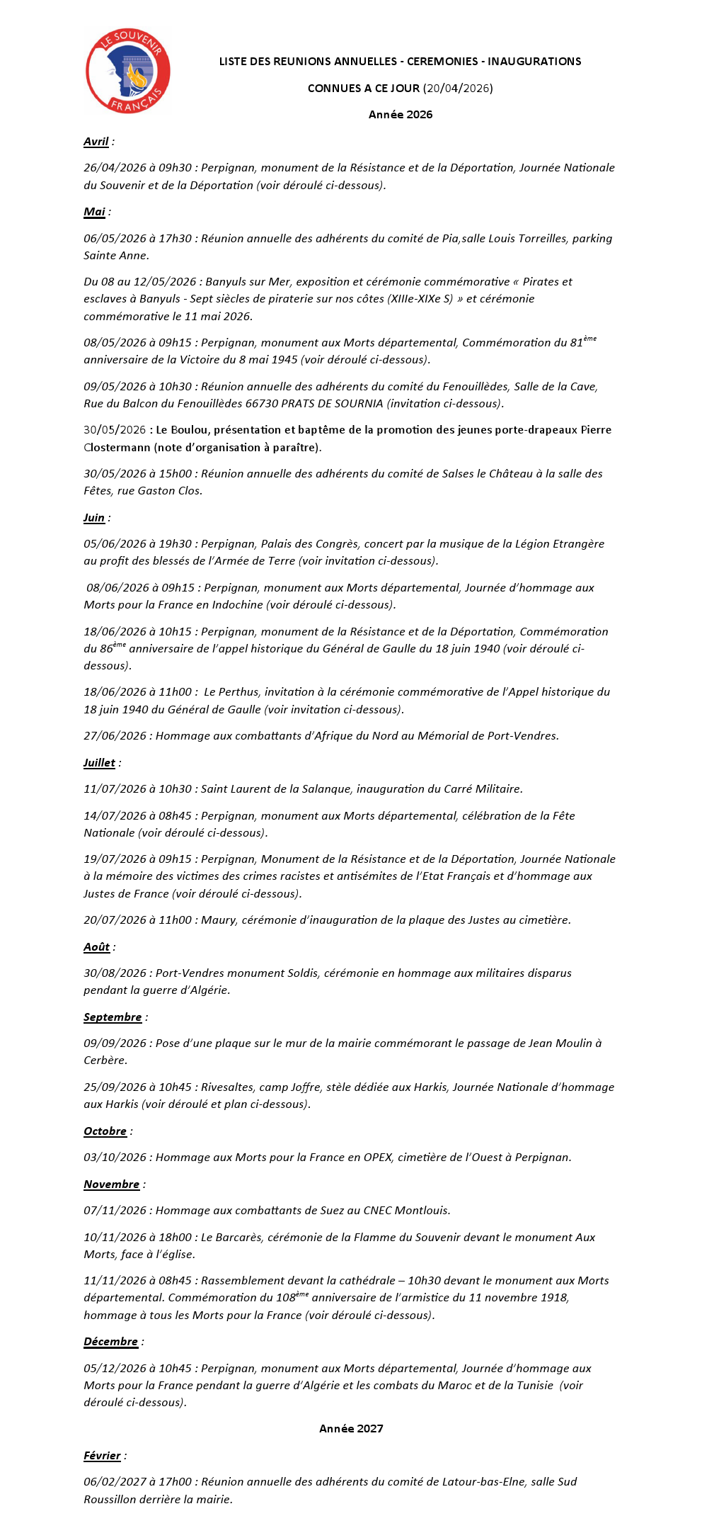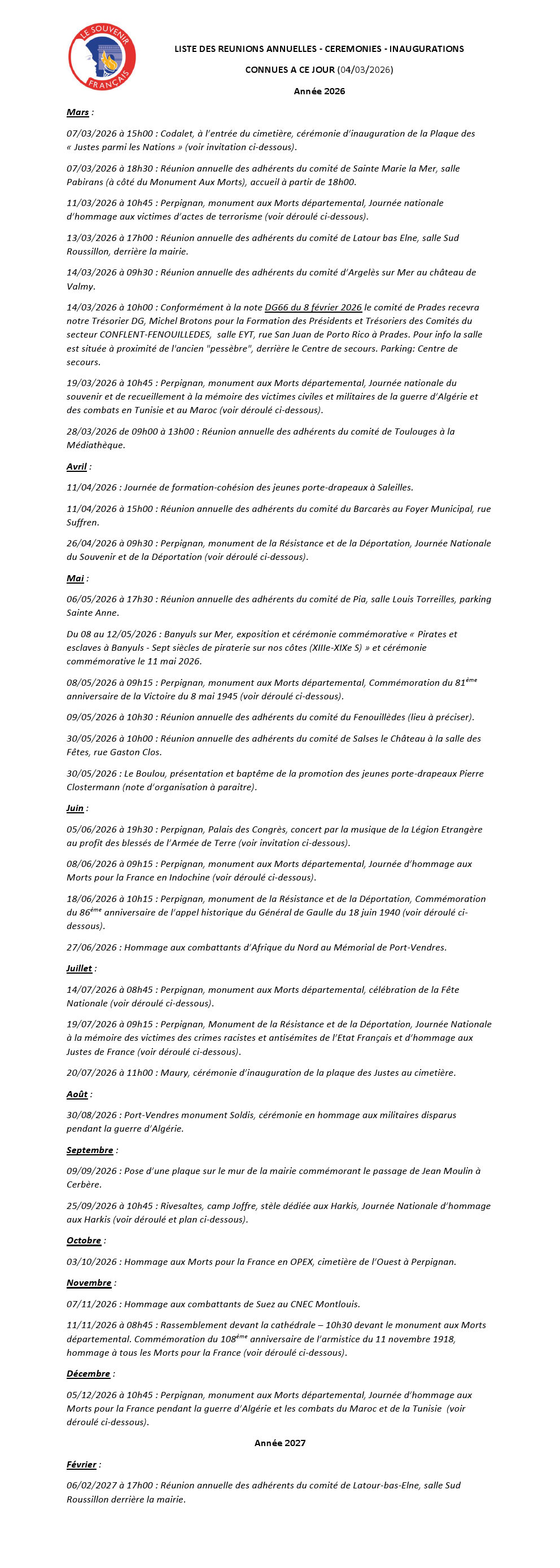 Liste des réunions annuelles - cérémonies - inaugurations