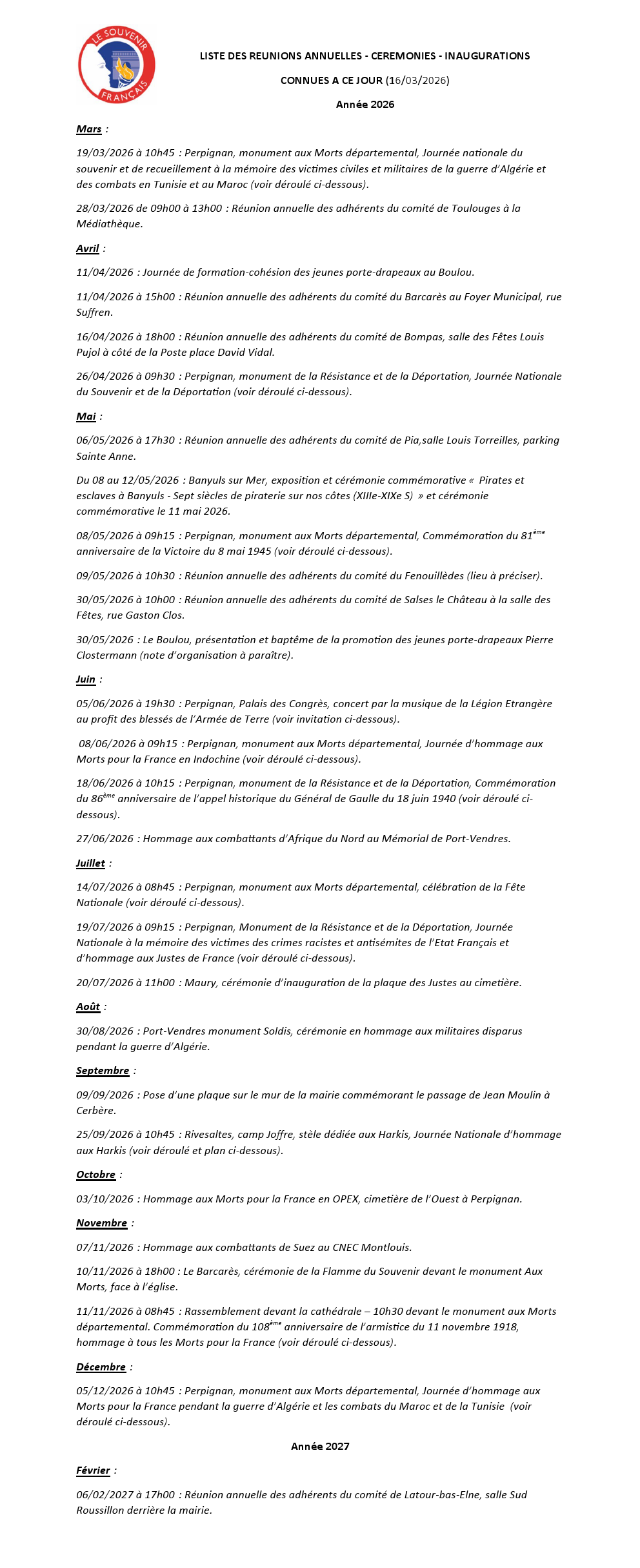 Liste des réunions annuelles - cérémonies - inaugurations